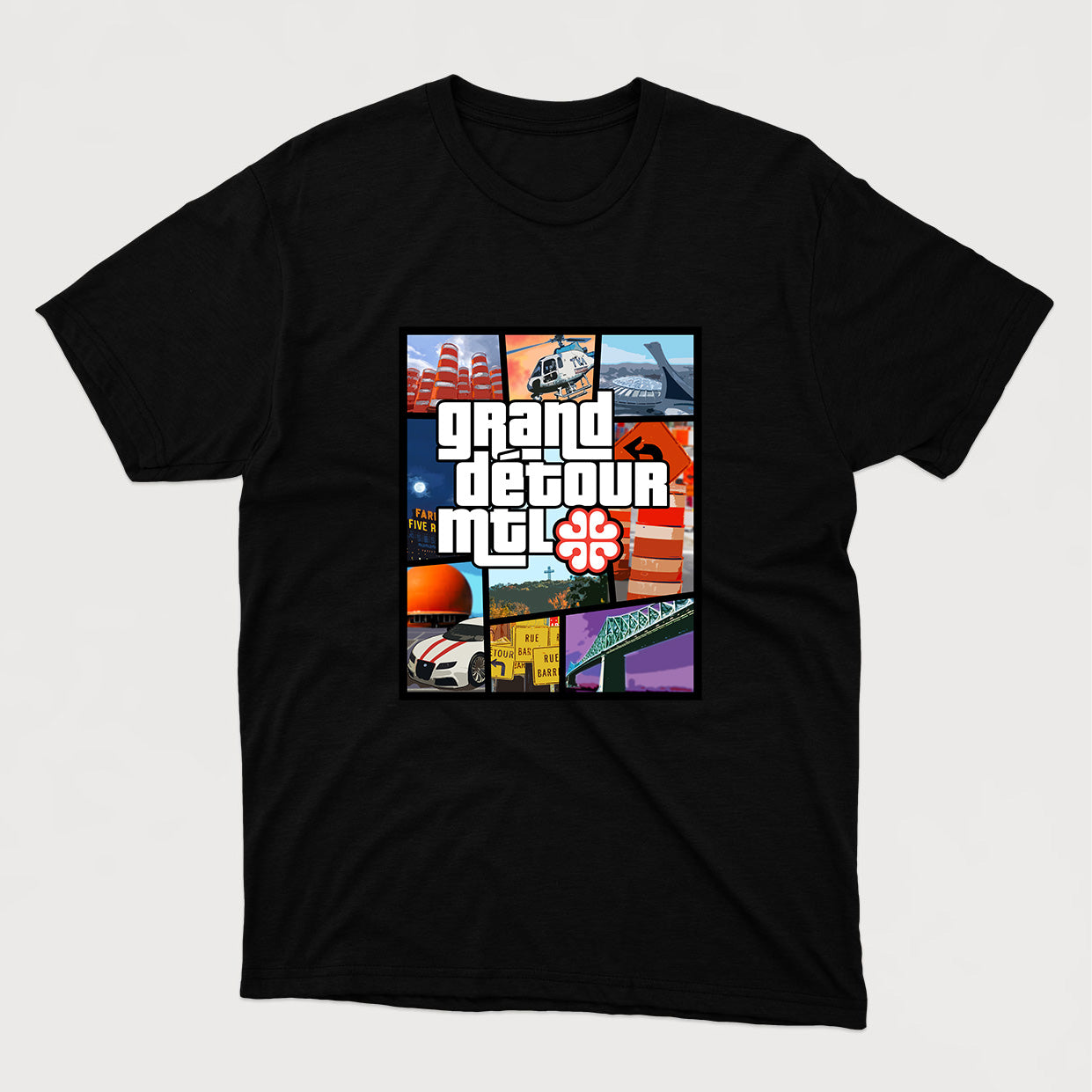 A bold nod to Montrealers' familiar reality: endless detours, ubiquitous orange cones, and eternal construction sites. Inspired by the iconic Grand Theft Auto style, this sweater humorously revisits the city's traffic chaos. It features familiar elements: detour signs, the Jacques Cartier Bridge, cones as far as the eye can see, and even the famous Orange Julep.