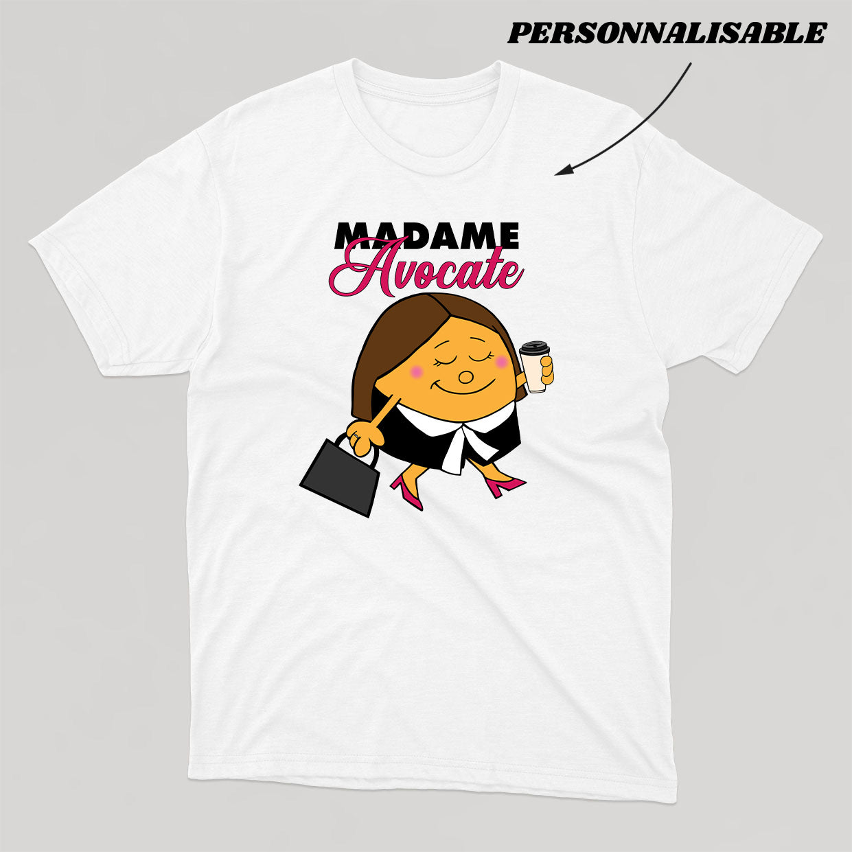 Customize your order by indicating in the comments what title you would like to give to your MADAME . Note that the customizable section is only the word LAWYER, the section MADAME and the drawing is fixed.